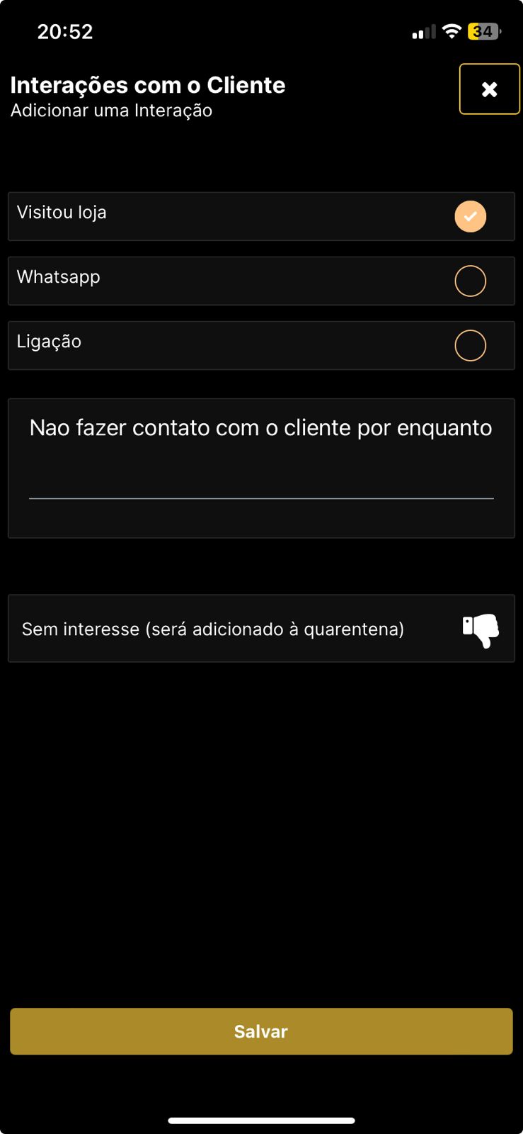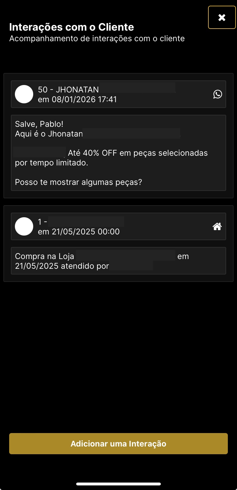 Também é possível adicionar novas interações manualmente, enriquecendo o histórico do relacionamento.