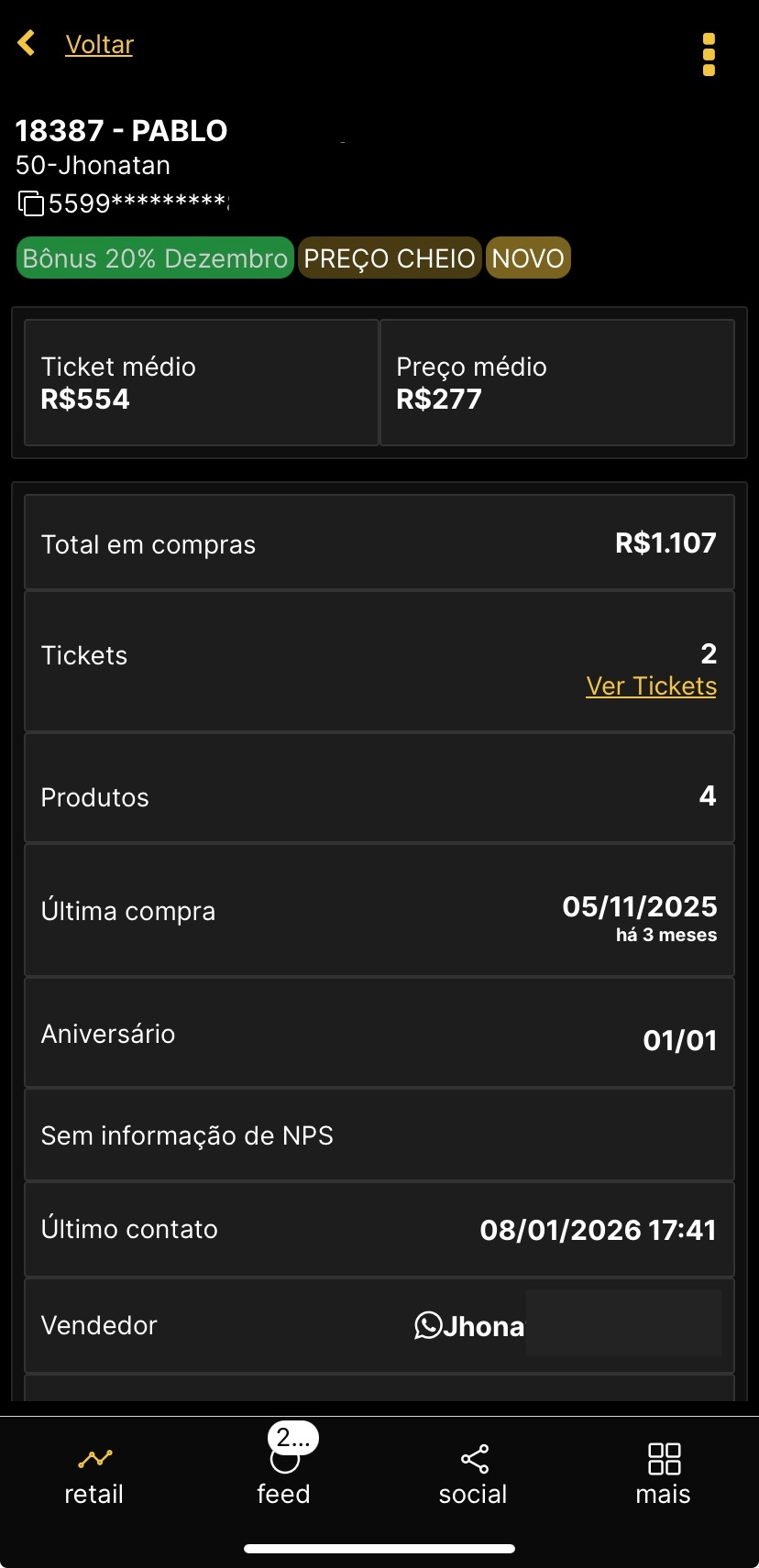 - Ticket médio;