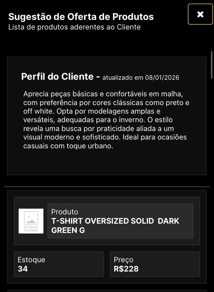 O sistema gera um resumo inteligente do perfil do cliente, baseado em seus hábitos de compra.