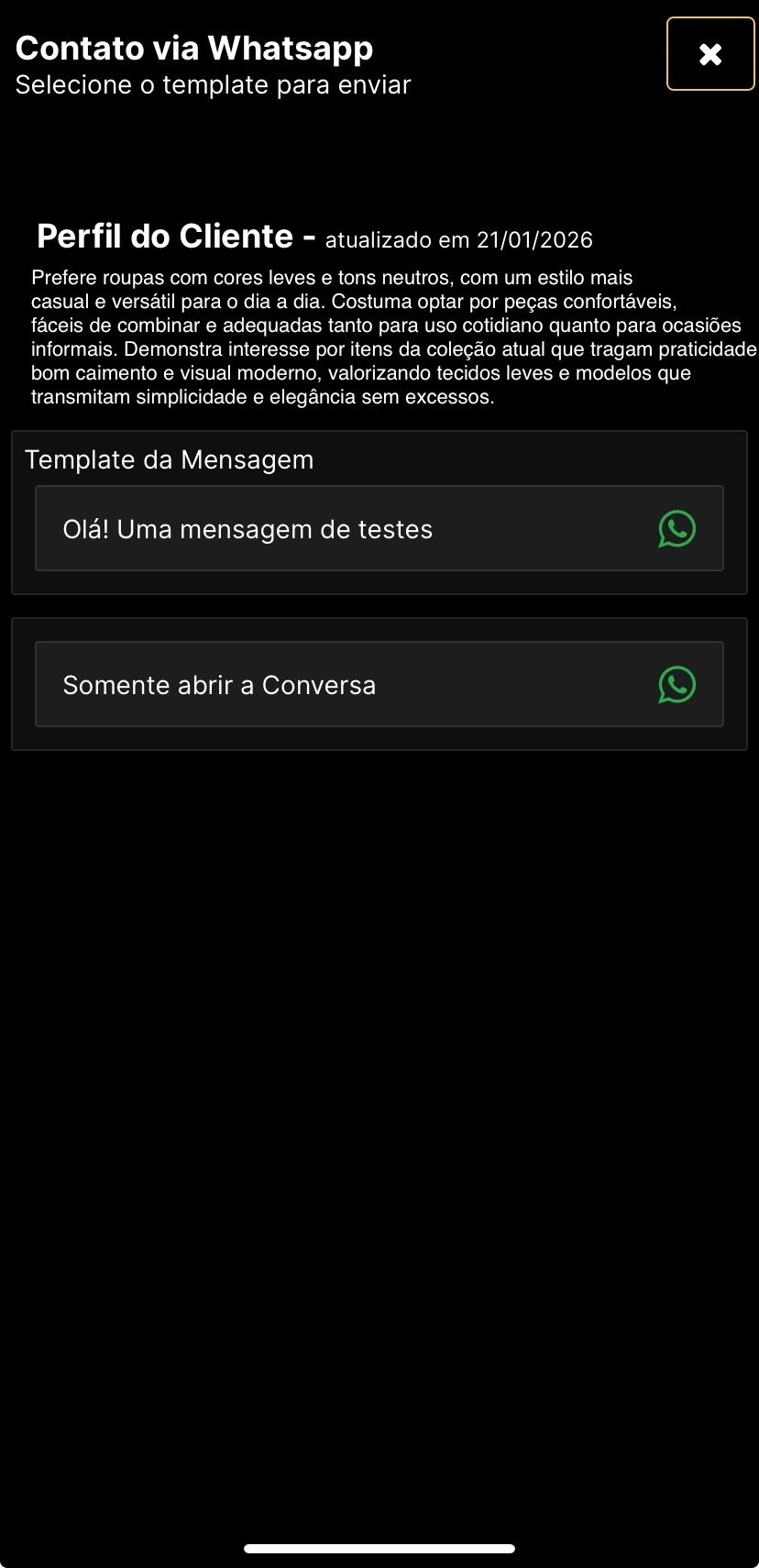 Na tela do WhatsApp, o sistema permite a interação direta com o cliente utilizando o WhatsApp do próprio vendedor, já instalado no celular.
