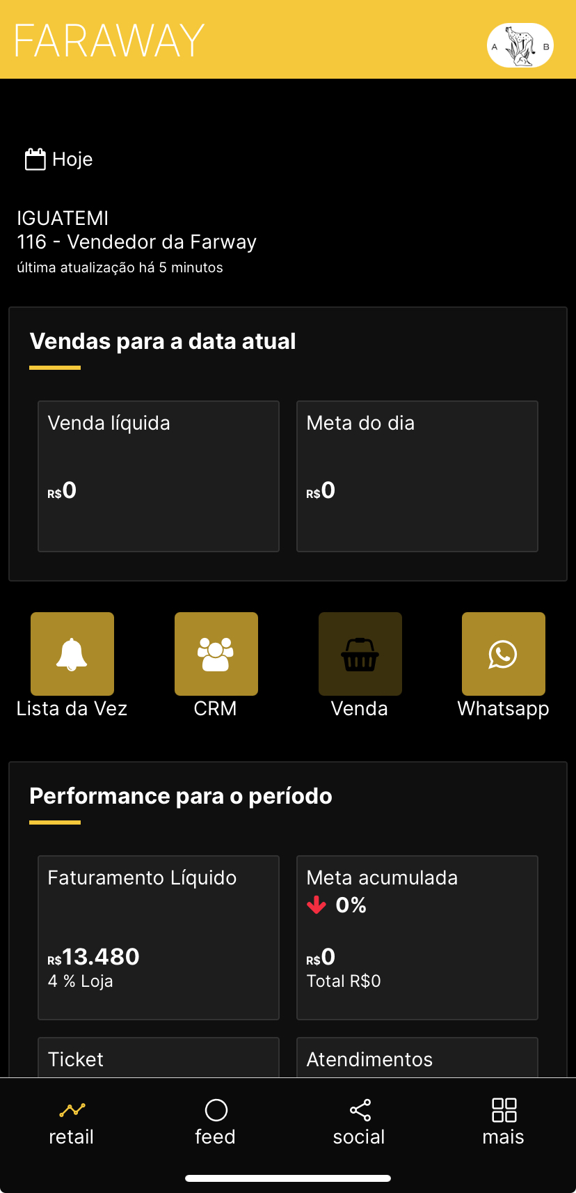 O acesso ao CRM está disponível logo na primeira tela do aplicativo WeRetail.