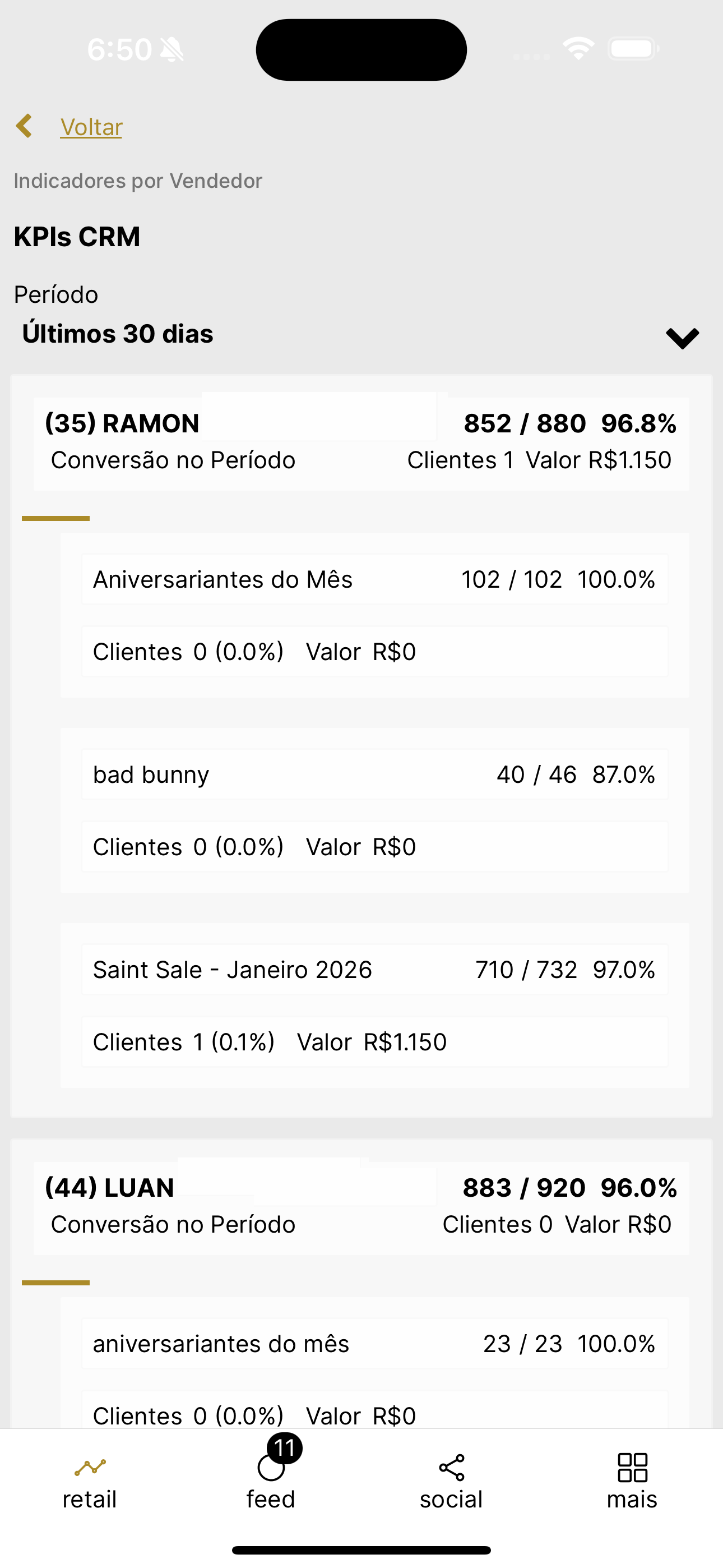 - Conversão total — resultado consolidado do vendedor no período selecionado.
