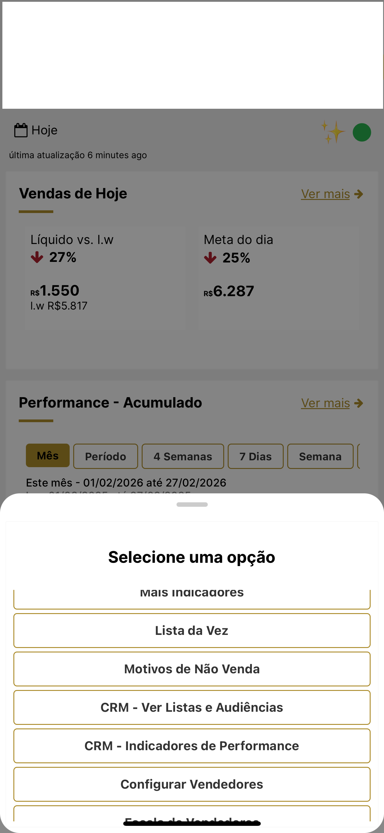 Ao abrir a tela, selecione o período que deseja visualizar. O sistema filtrará todos os dados de performance de acordo com o intervalo escolhido.